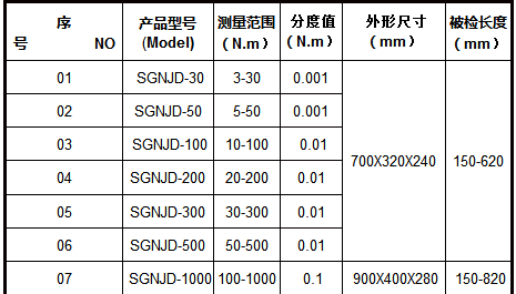SG系列便携式扭矩扳手检定仪具有静态扭矩检测功能。该扭矩扳手检定仪产品显示准确性能稳定寿命长、安装简便和使用方便等。我司扭矩扳手检定仪采用特别的抗冲击和消除附加力的结构设计,确保了扭矩检测稳定、精确、可靠,非常适于生产装配现场各类型扭矩工具的在线力矩调整及检测。其附件的标定装置(选配件)可对该扭矩扳手检定仪产品进行定期校准。